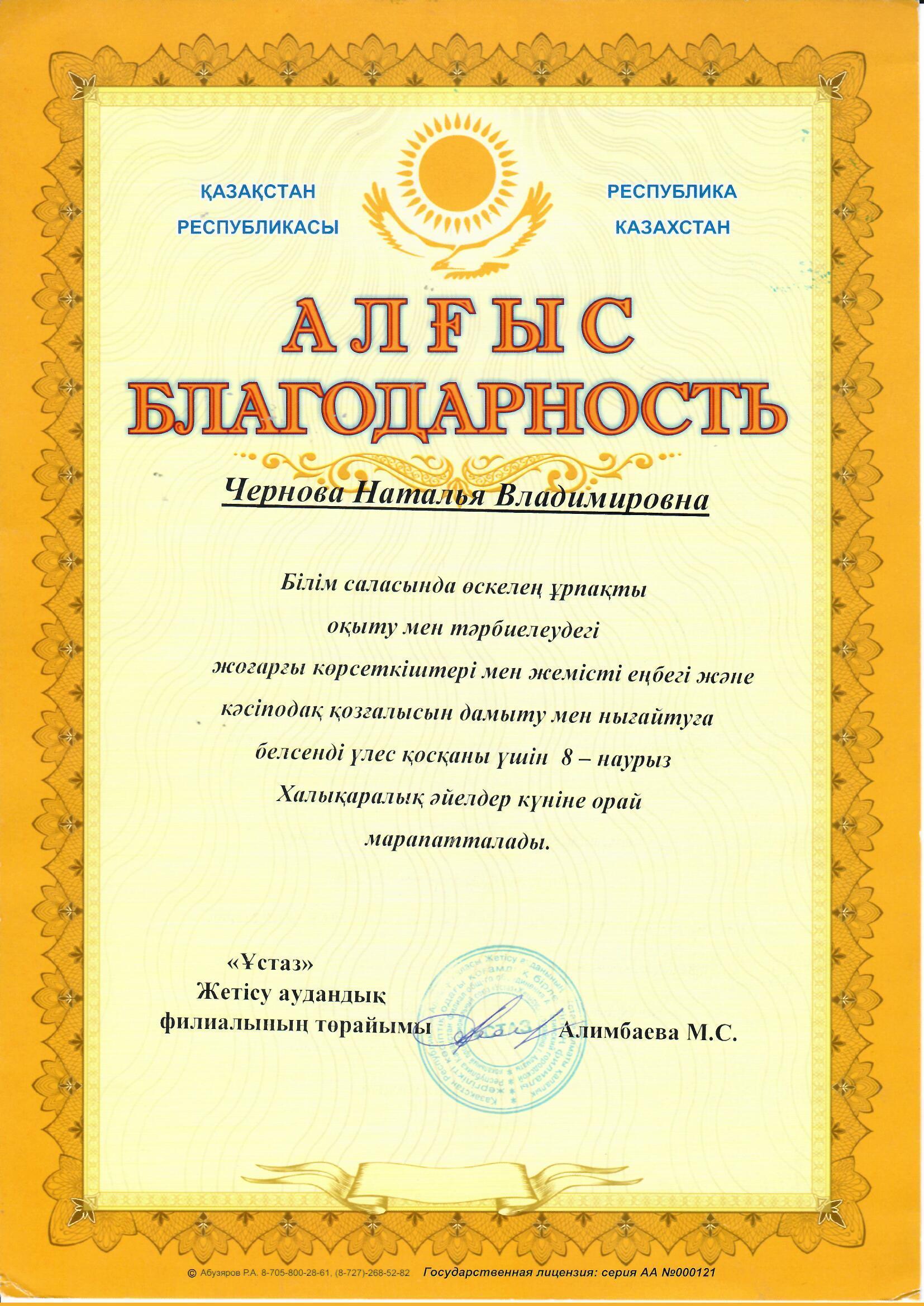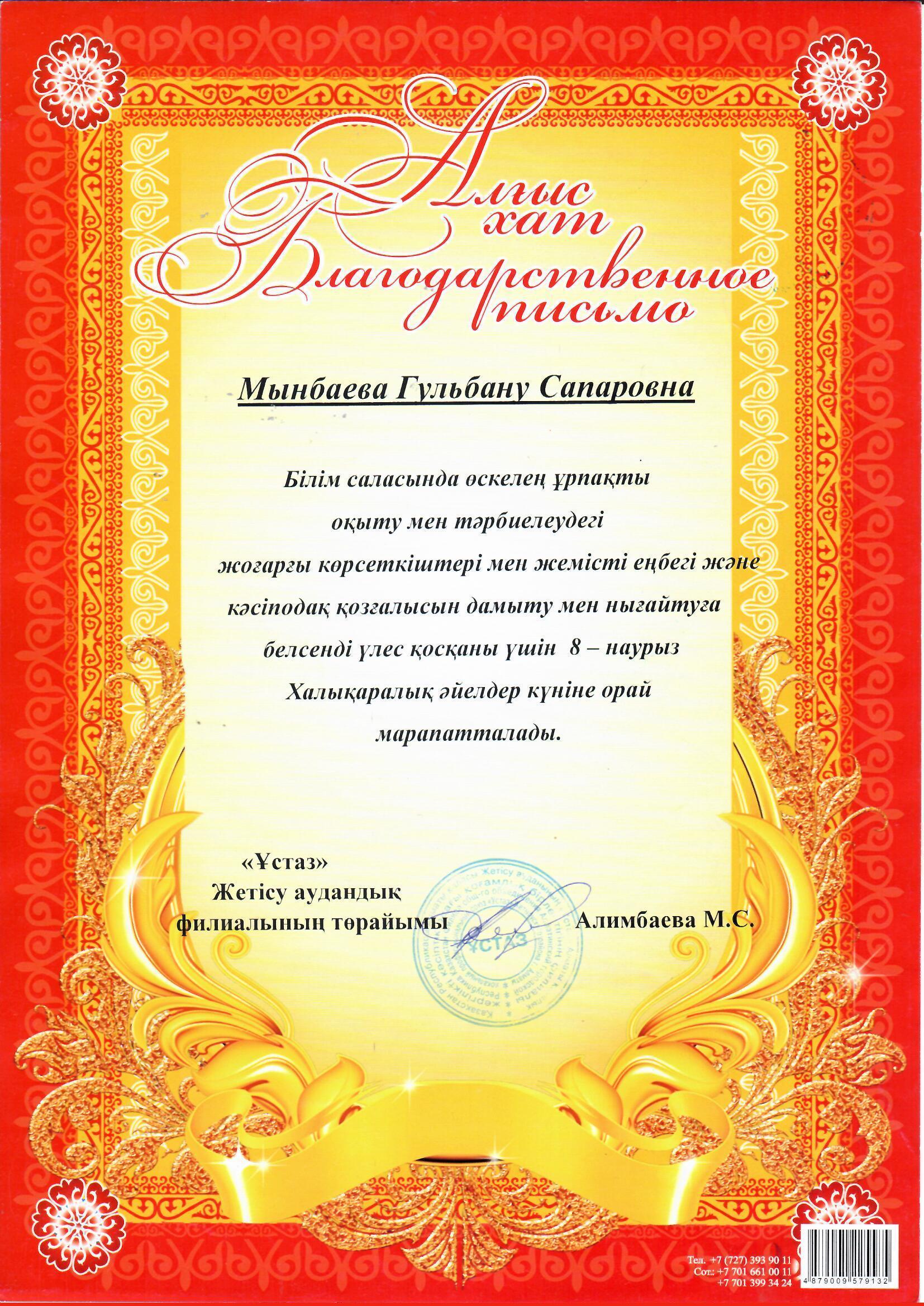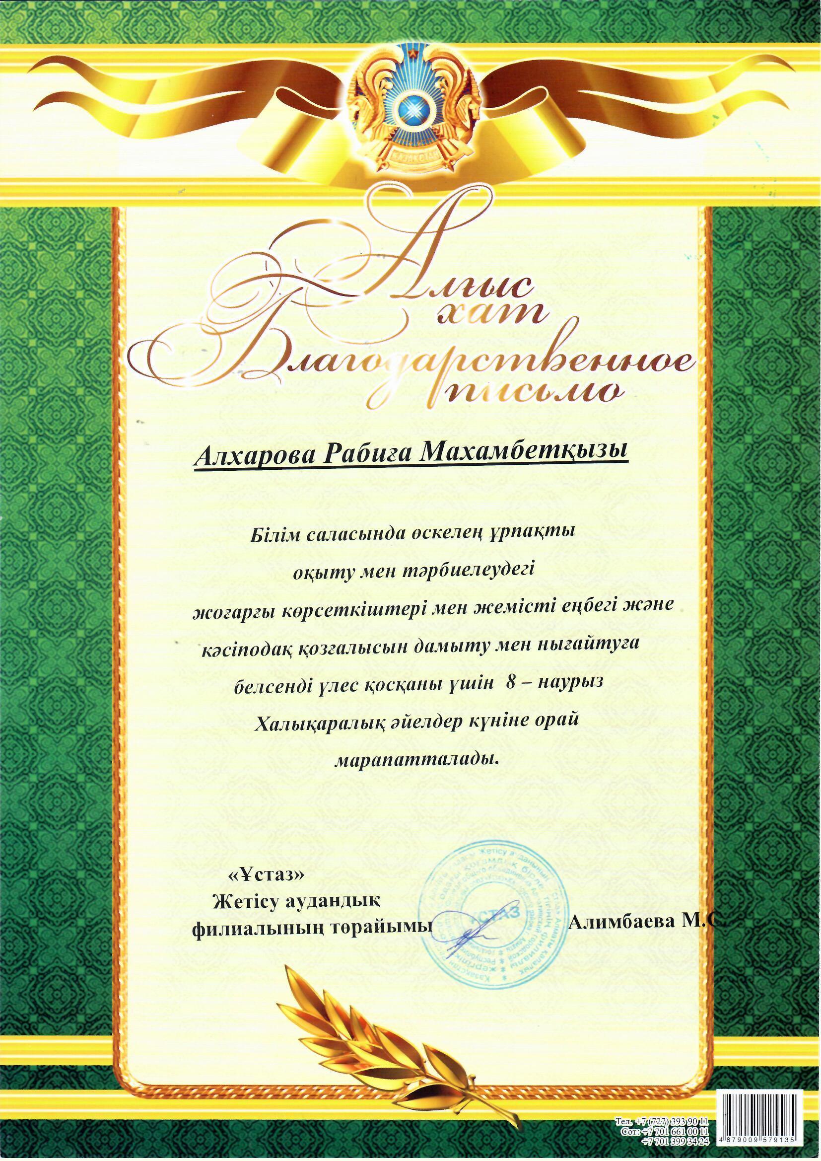 Алхарова Р.М , Чернова Н.В, Мынбаева Г.С. Білім саласында өскелең ұрпақты оқыту мен тәрбиелеудегі жоғарғы көрсеткіштері үшін және 8- наурыз Халықаралық әйелдер күніне орай "Ұстаз" Жетісу аудандық филиалының төрайымы Алимбаева М.С. мараппатталды