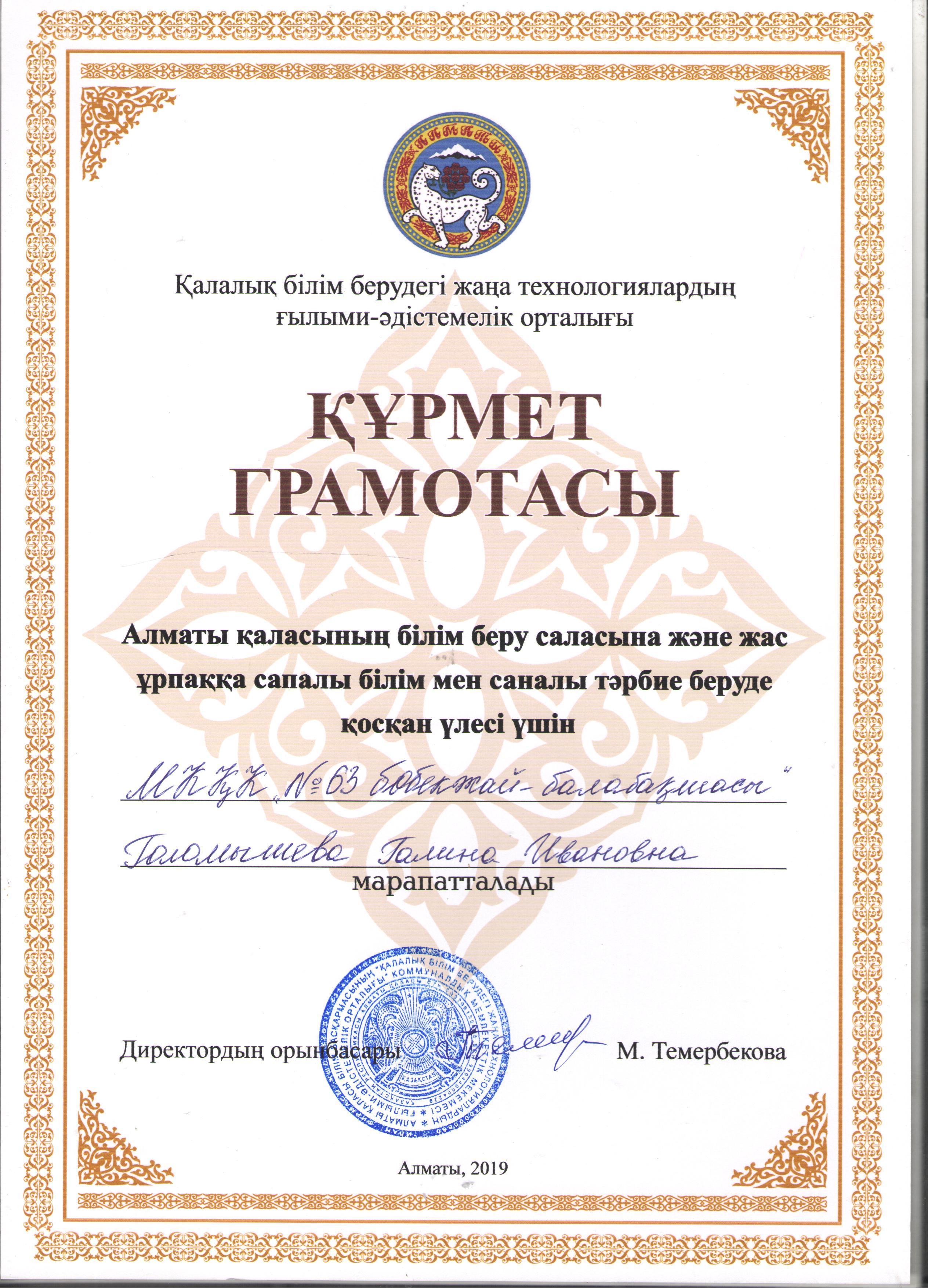 02 қыркүйек 2019 100 1 2 3 4 5 Голомышева Г.И. Қалалық білім берудегі жаңа технологиялардың ғылыми -әдістемелік орталығының Құрмет грамотасымен марапатталды.