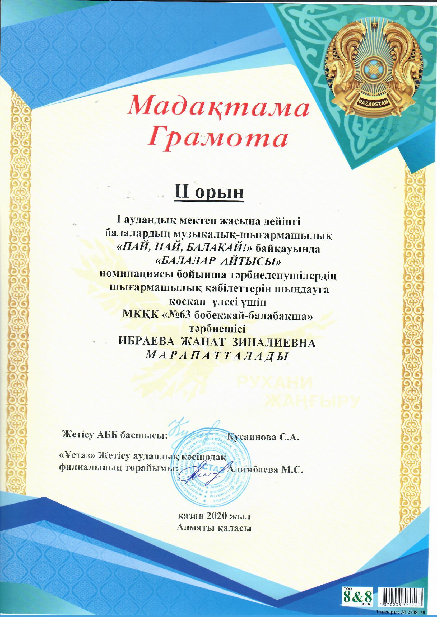II орын I аудандық мектеп жасына дейінгі балалардың "ПАЙ, ПАЙ, БАЛАҚАЙ!" байқауында "БАЛАЛАР АЙТЫСЫ" номинациясы бойынша тәрбиеленушілердің шығармашылық қабілеттерін шыңдауға қосқан үлесі үшін Ибраева Ж.З. МАРАПАТТАЛДЫ. » ГККП "Ясли сад №63"