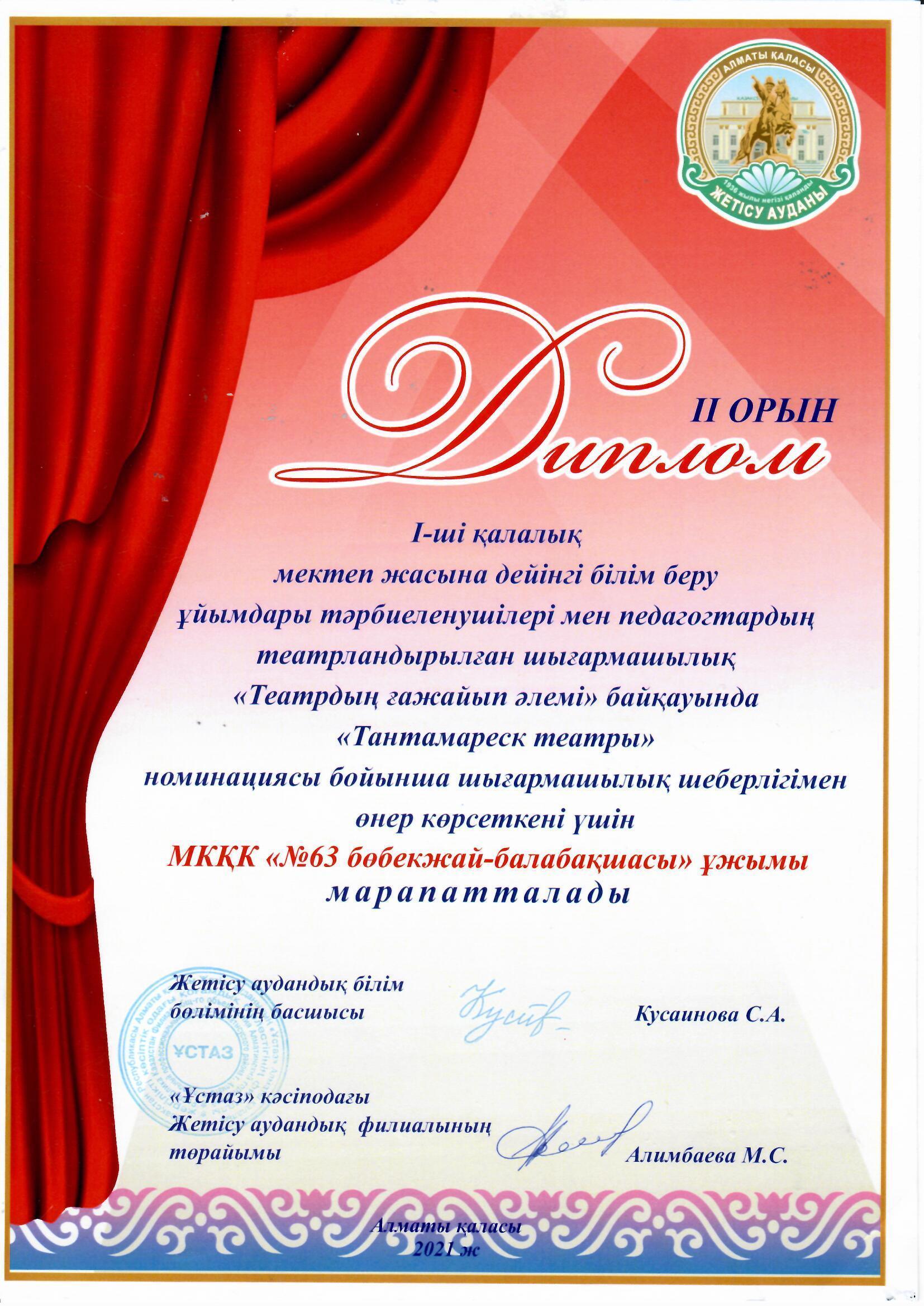 II орын аудандық "Театр ғажапйып әлемі" байқауында "Тантамареск театры" номинациясы бойынша шығармашылық белсенділік көрсеткені үшін балабақша ұжымы марапатталды. » ГККП "Ясли сад №63"