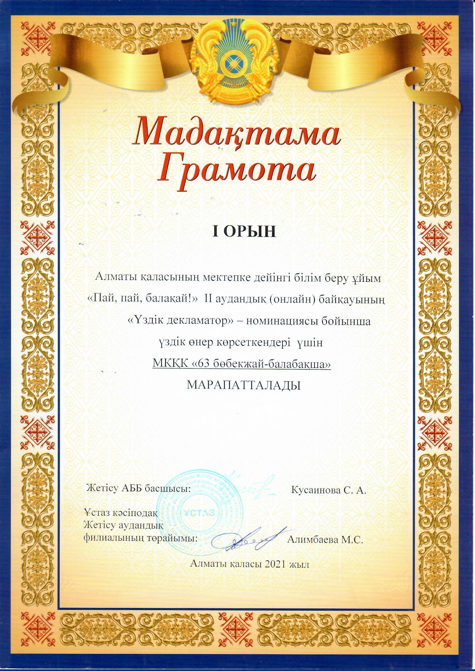 ГККП "Ясли сад №63" » Біз туралы » Тарихымыз » I орын "Пай, пай, балақай!" II аудандық (онлайн) байқауының "Үздік декламатор" - номинациясы бойынша 63 балабақша ұжымы марапатталды.