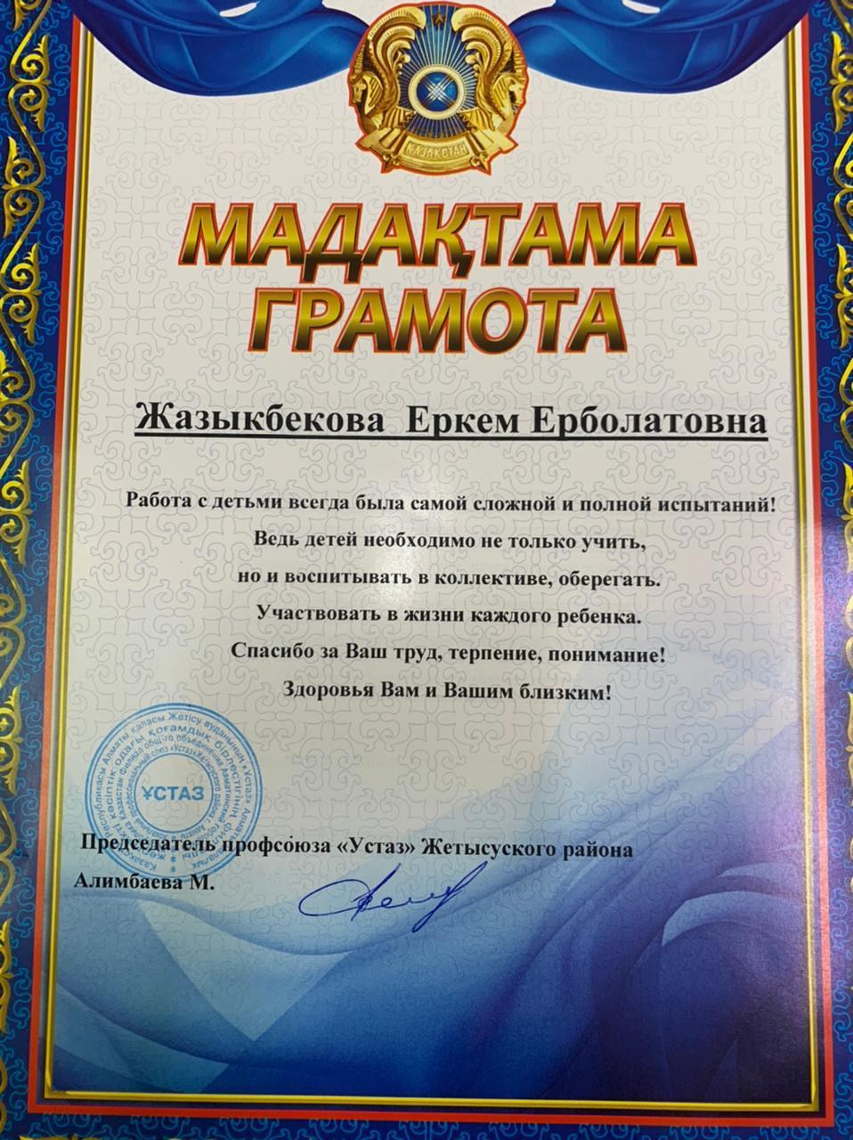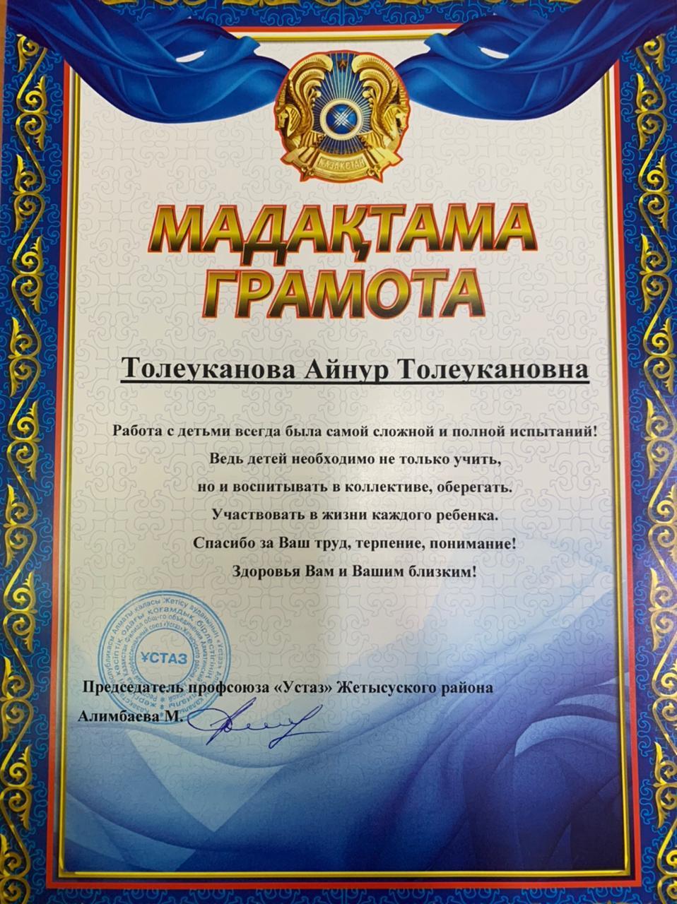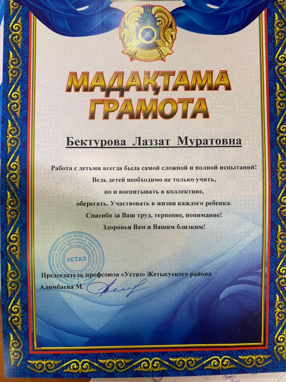 Бектурова Л.М, Толеуканова А. Т, Жазықбекова Е.Е . Білім саласында оқыту мен тәрбиелеудегі жоғары көрсеткіштері үшін ұстаздар күніне орай “Ұстаз” Жетісу аудандық филиалының төрайымы Алимбаева М.С дан марапатталды.