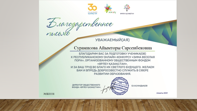"ӨРЛЕУ ҚАЗАҚСТАН" қоғамдық қоры тарапынан ұйымдастырылған Республикалық "Қыстың күйі көңілді" онлайн сайысына шәкірт дайындап, олардың болашағы жарқын болуы үшін қызмет еткені үшін Сурамисова Айымторы Сарсенбековна марапатталды.