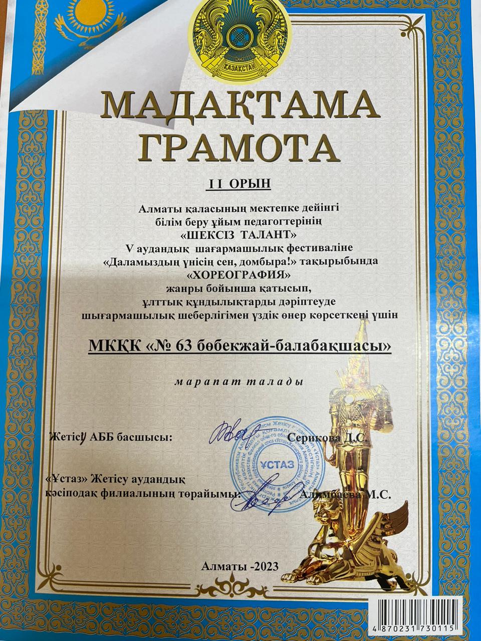 "ШЕКСІЗ ТАЛАНТ" V аудандық шығармашылық фестивалінде «Даламыздың үнісің сен, домбыра!» атты "ХОРЕОГРАФИЯ" жанры бойынша №63 балабақша ұжымы II орынмен марапаталды.
