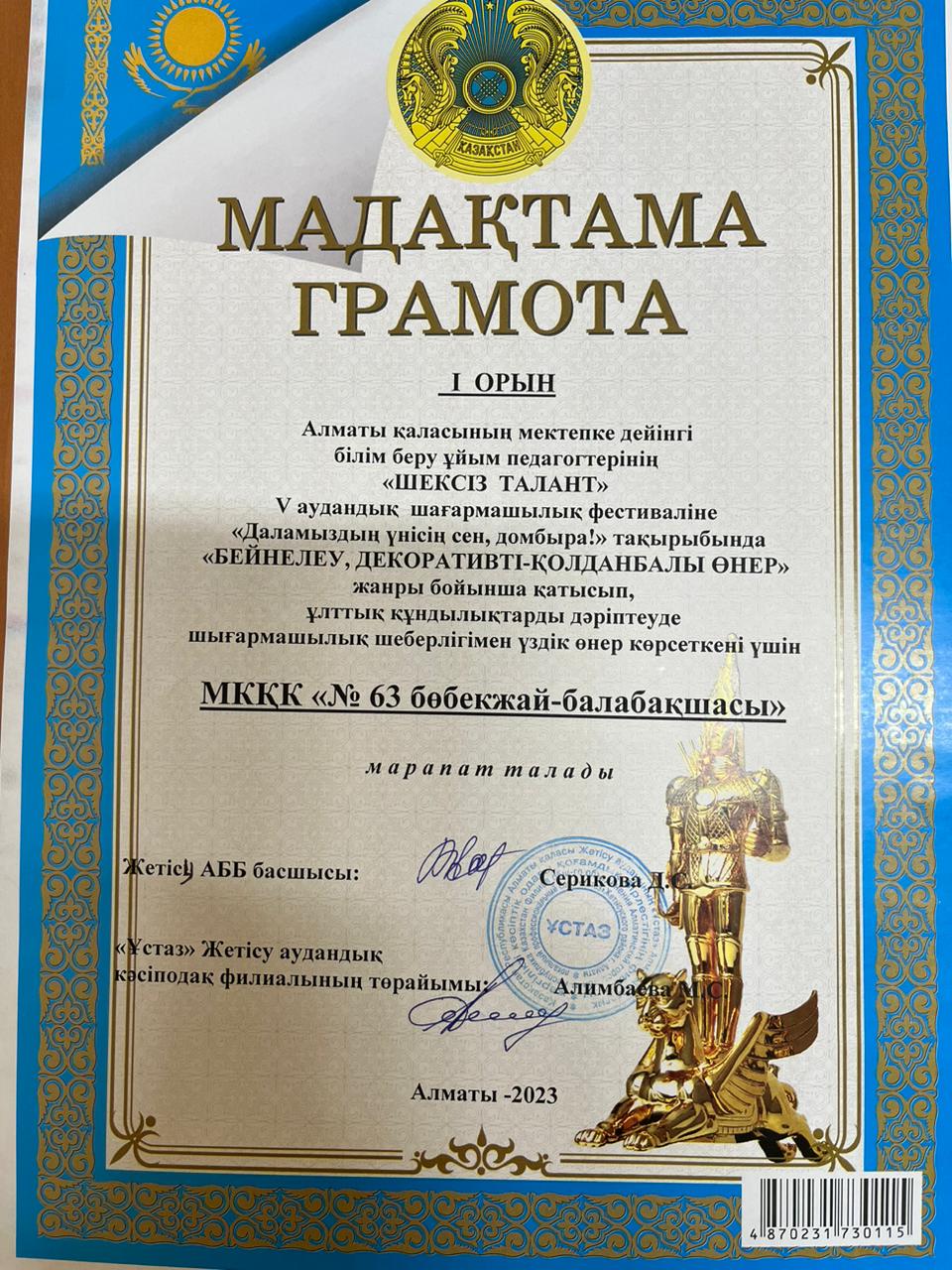 "ШЕКСІЗ ТАЛАНТ" V аудандық шығармашылық фестивалінде «Даламыздың үнісің сен, домбыра!» атты "Бейнелеу, декоративті-қолданбалы өнер" жанры бойынша №63 балабақша ұжымы I орынмен марапаталды. » ГККП "Ясли сад №63"
