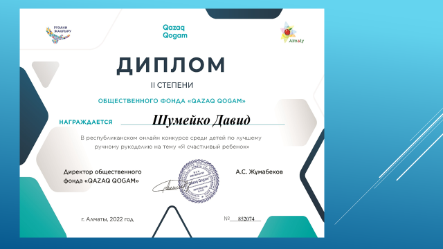 Награждается Шумейко Давид в республиканском онлайн конкурсе среди детей по лучшему ручному рукоделию на тему " Я счастливый ребенок" » ГККП "Ясли сад №63"